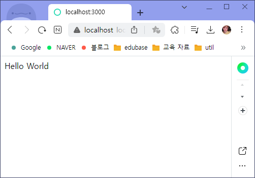 - 루트 경로 '/' 를 지정하면 'Hello World'가 뜨도록 프로그래밍되어 있으니 진짜 그렇게 되는지 확인해보기