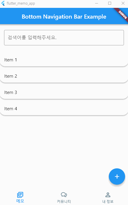 - 커뮤니티 페이지, 내 정보 페이지 (빈 페이지, 각각 바텀 내비게이션 바의 인덱스 1, 2)