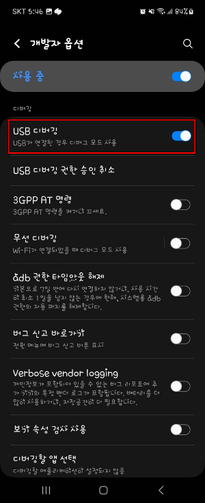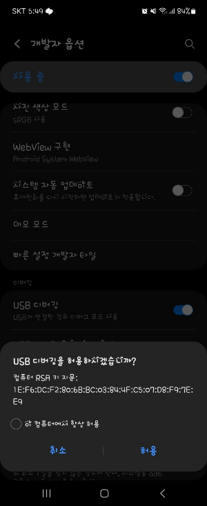 - 만약 자신의 기기가 보이지 않을 경우 USB 디버깅을 비활성화 했다가 다시 활성화로 변경