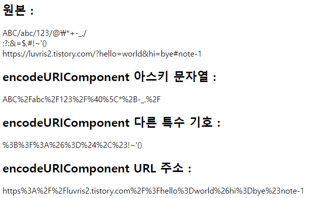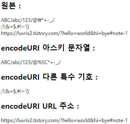 html += "<h2> encodeURI 다른 특수 기호 : </h2>" + encodeURI(addStr) + "<br>";