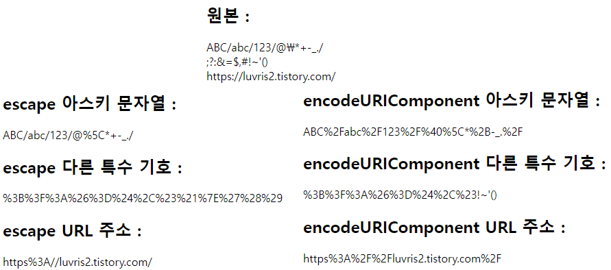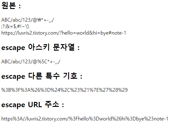 - 최신 브라우저에서는 escape 함수를 호출할 때 브라우저가 RFC 3986 인코딩을 적용한다.