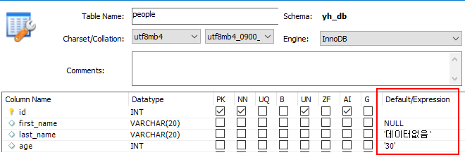 - Default/Expression 을 이용하여 NULL값이 아닌 다른 데이터를 출력 할 수 있음