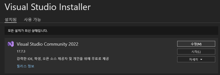 - 혹은 Visual Studio 가 설치되어 있다면 Visual Studio Installer 실행