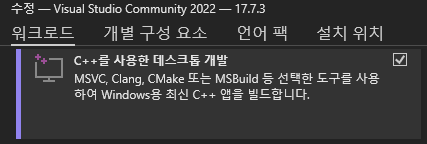- 워크로드 탭에서 'C++를 사용한 데스크톱 개발' 선택 후 설치