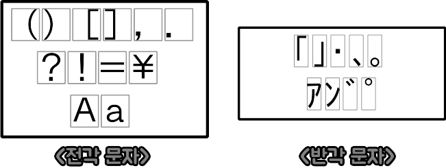 - 전각 : 정사각형 형태, 가로와 세로 길이 비율이 동일한 문자