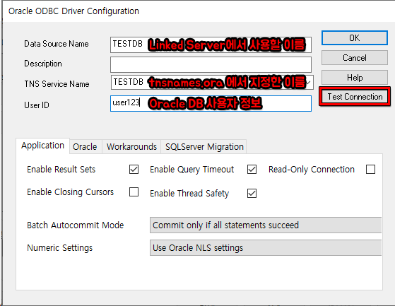 새로운 ODBC Oracle Driver Configuration 창에 설정한 오라클 TNS 정보를 입력해주자.