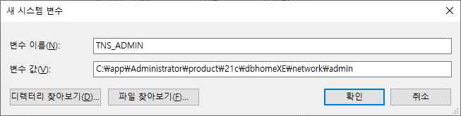 TNS_ADMIN 환경 변수의 경로는 오라클 설치 위치에서 network - admin 경로이다.