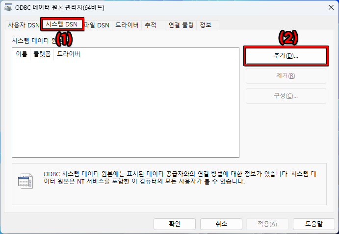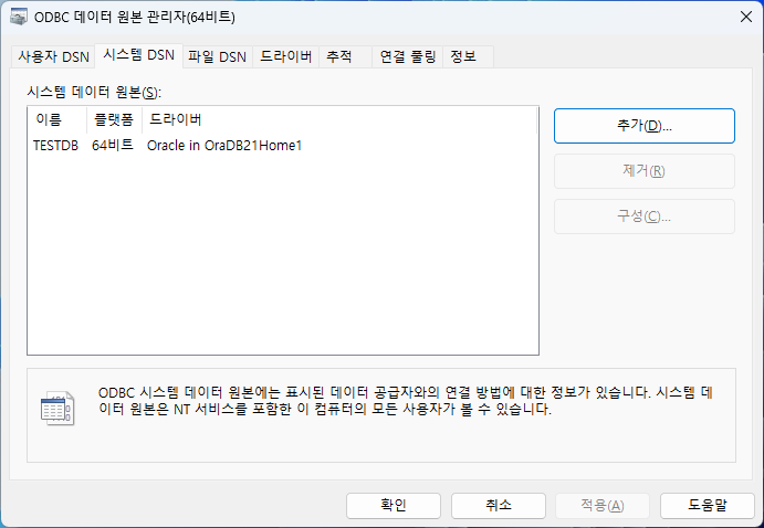 오라클 ODBC 접속 설정 (ODBC 데이터 원본 관리자 설정)