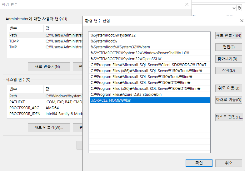 - 시스템 변수 > path > 오라클 관련 경로 삭제