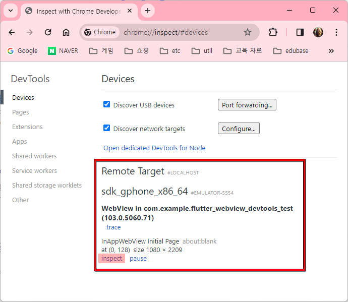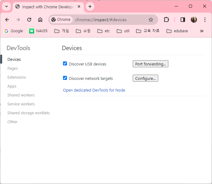 크롬 브라우저를 열어 주소창에 chorome://inspect 를 입력하여 이동한다.