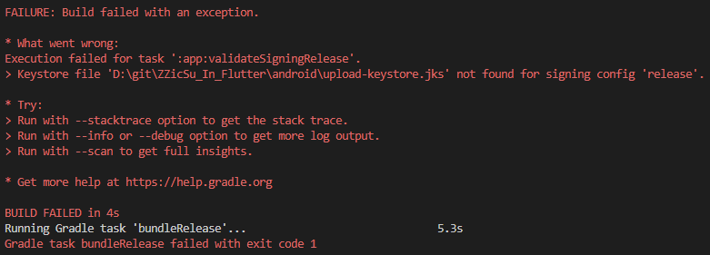 > Keystore file '~\android\app\upload-keystore.jks' not found for signing config 'release'.