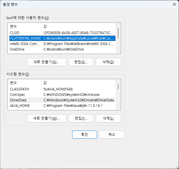 - 사용자 변수 - Path - 새로 만들기 (%FLUTTERFIRE_HOME%)