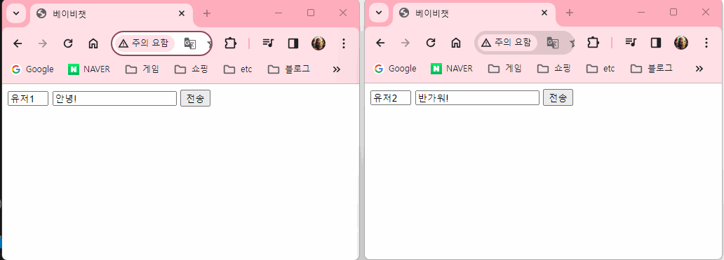 아래의 예시 이미지는 테스트용 채팅 서버를 열고,