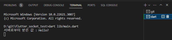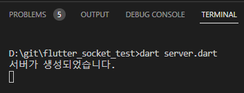 - 터미널에서 생성한 서버 다트 파일 실행 (server.dart)