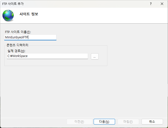 - 사이트 마우스 우클릭 - FTP 사이트 추가