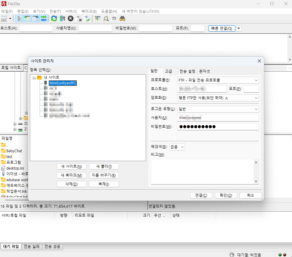 구축한 FTP 사이트 정보를 입력 한 후, 연결을 시도한다.