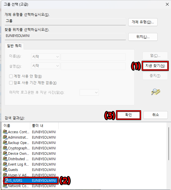 - 지금 찾기 - IIS_IUSRS 선택 - 확인