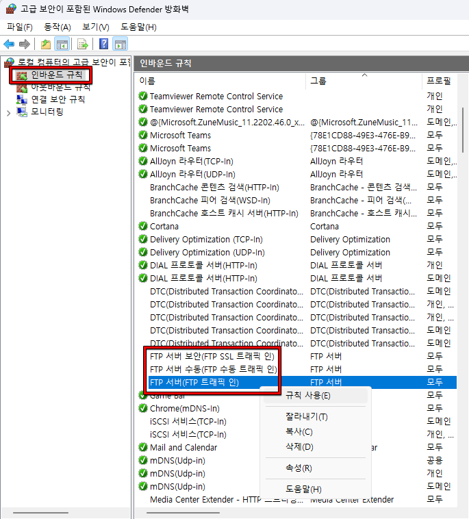 - 인바운드 규칙 - 세 개의 항목 마우스 우클릭 - 규칙 사용