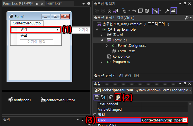 notifyIcon을 선택 한 후, 속성 창의 '동작' - 'ContextMenuStrip'에 연결할 ContextMenuStrip을 선택한다.