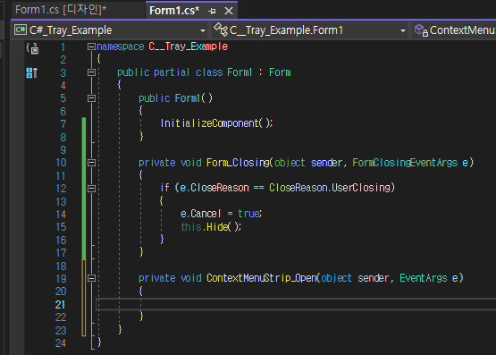 - 사용자가 폼을 닫을 때, 종료 기능 대신 폼을 숨기는 기능으로 변경