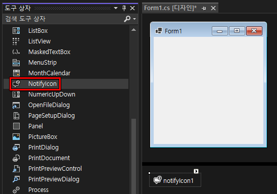 C# Winform 프로젝트를 생성 한 후, 도구 상자에서 NotifyIcon을 폼에 추가한다.