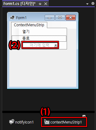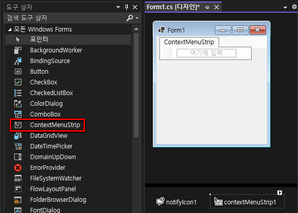 도구 상자에서 ContextMenuStrip을 폼에 추가한다.