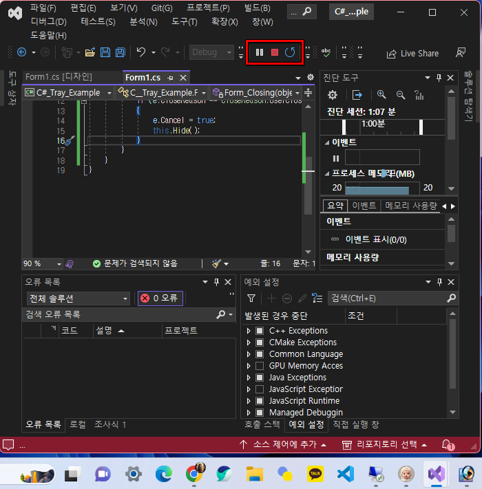폼의 닫기 버튼을 눌러도 프로그램이 종료되지 않게 하기 (Hide)