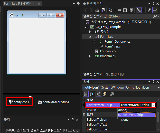 그리고 생성한 notifyIcon 컨트롤과 연결을 해준다.