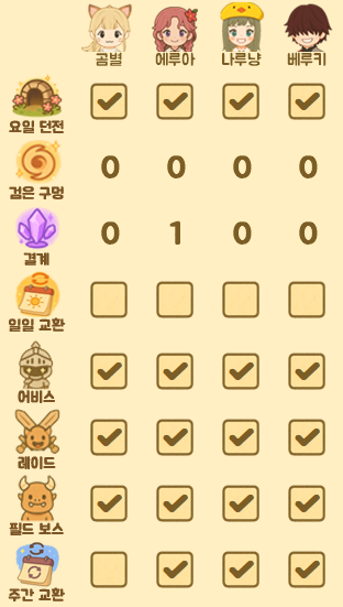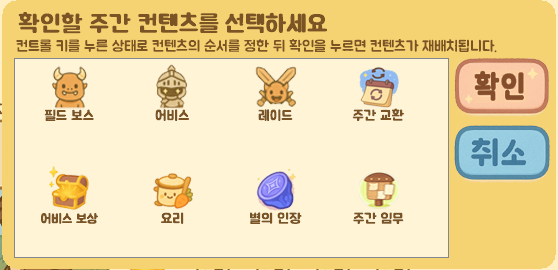매일 또는 주간 단위로 반복되는 콘텐츠들의 진행 여부를 체크할 수 있으며,
