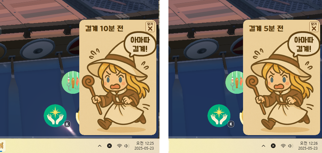 - 윈도우 화면 우측 하단(시계 바로 위)에 결계 알림 팝업창을 출력하도록 추가