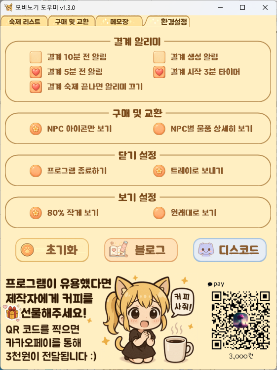 프로그램의 이상이 보인다면, '환경설정 -> 초기화' 기능을 이용해주세요.